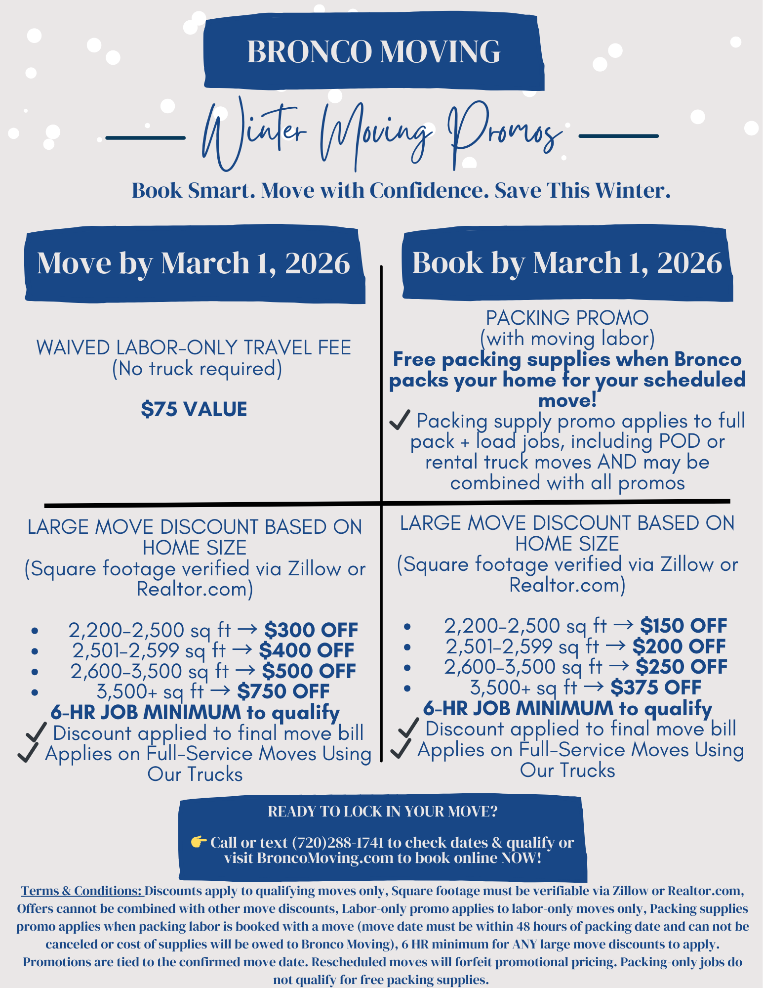 To receive our lowest price guarantee, submit the written quote to BroncoMovingCO@gmail.com.